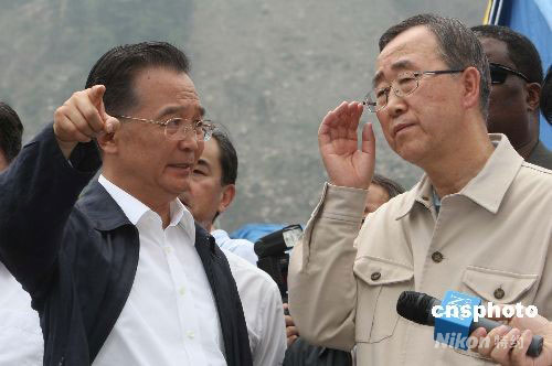 温家宝向潘基文介绍映秀镇地震灾区情况