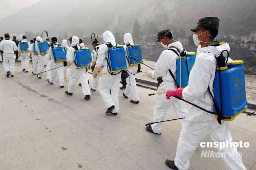 图:救灾部队在汶川映秀镇展开消毒防疫