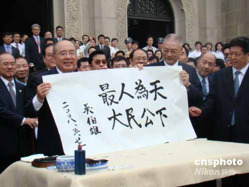 中国国民党主席吴伯雄率领的大陆访问团拜谒中山陵,并题字“天下为公 人民最大”。中新社发 丁梅 摄