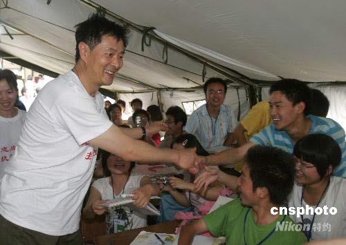 5月26日,濮存昕、林志颖、王宝强等艺人前往地震重灾区什邡市一中学帐篷教室看望复课学生。这些艺人是参与由中国扶贫基金会主办的“5·12青少年关爱基金——明星义工行动”的第一批明星义工。经历过台湾9·21大地震的林志颖作为台湾第一位亲赴内地参加赈灾行动的艺人,认为灾区的小朋友是最需要帮助的人。中新社发 张晓理 摄