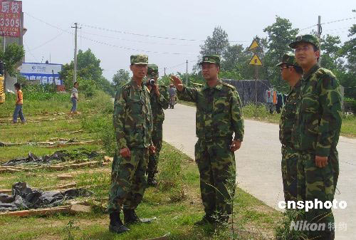 唐家山堰塞湖对绵阳市境内的兰成渝输油管道大动脉形成重大威胁,6月4日,成都军区一舟桥部队的600余名官兵已迅速抵达江油市九岭镇,对该输油管道进行抢险保通任务。中新社发 霍潺 摄