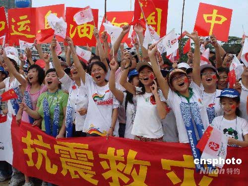 当地民众举着国旗和奥运五环旗,高喊“中国加油”、“四川加油”。中新社发 黄艳梅 摄