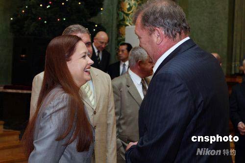6月10日,中国驻俄大使刘古昌在使馆为俄方赴华抗震救灾医疗队举行答谢招待会。图为俄紧急救灾部部长绍伊古的女儿尤利娅和同事在活动现场。尤利娅是俄紧急情况部紧急心理救助中心主任、心理学副博士,四川发生大地震后,她被父亲亲自派往地震灾区进行救援。中新社发 田冰 摄