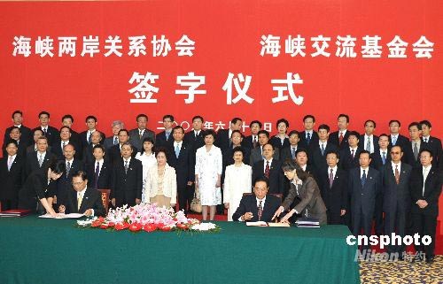 陈云林和江丙坤签署"周末包机 大陆赴台游"协议