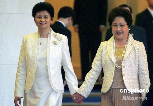 陈云林夫人与江丙坤夫人携手进入签字大厅