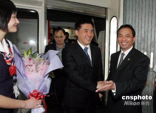 6月23日下午,台北市长郝龙斌抵达上海浦东国际机场,开始对上海进行为期5天的访问,这是新中国成立以来,台北市长首次访问上海。图为上海市台办主任杨建荣(右)到机场迎接。中新社发 潘索菲 摄