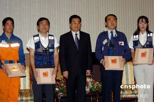 胡锦涛在札幌向日本国际救援队医疗队赠送礼品