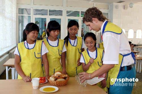 俄罗斯辅导员教地震灾区孩子摆餐具