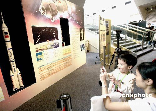 九月二十四日,香港市民在太空馆大堂参观“神舟七号——中国首次太空漫步”展览。中新社发 张勤 摄
