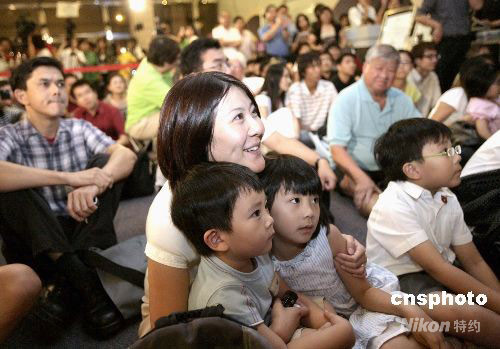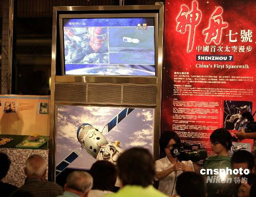 九月二十五日晚,香港市民在太空馆观看“神舟七号”升空直播。中新社发 张勤 摄