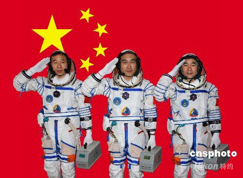执行神舟七号载人航天飞行任务的航天员翟志刚(中)刘伯明(右)景海鹏(左)向祖国和人民致以庄严的军礼。中新社发 秦宪安 摄