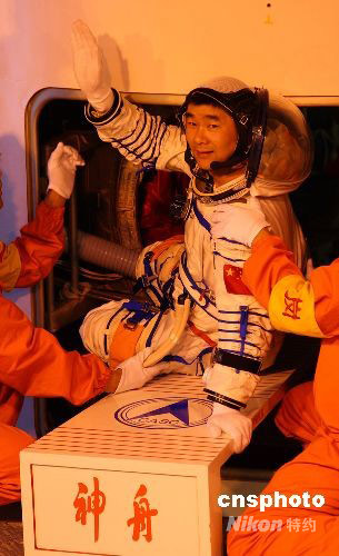 刘伯明进入神舟七号飞船返回舱。 中新社发 秦宪安 摄