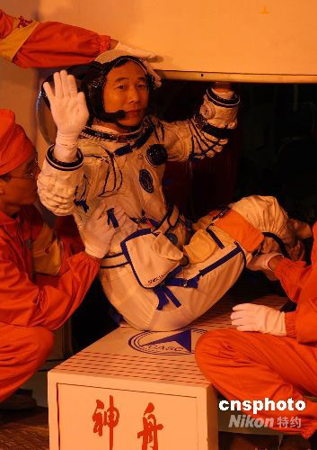 景海鹏进入神舟七号飞船返回舱。中新社发 秦宪安 摄