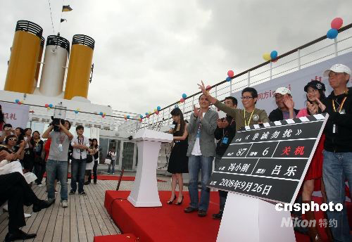 9月26日,冯小刚携09年贺岁新片《非诚勿扰》全体主创人员搭载歌诗达豪华邮轮完成电影拍摄返沪,并在邮轮上举行了《非诚勿扰》的关机仪式。中新社发 汤彦俊 摄