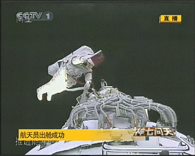 图:“神七”航天员翟志刚走出舱外开始实施出舱活动