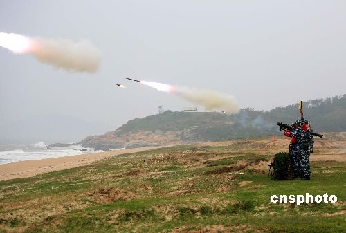10月12日下午,海军陆战队某旅在南海某海岛组织某型防空导弹实弹射击考核。是时,考核地域阴雨蒙蒙,风大浪高,能见度低,很难清楚辨认航模靶机的具体目标方位。该旅导弹营官兵凭借平时所练就的扎实基本功,在恶劣的天候条件下,沉着冷静,果断寻找最佳战机,捕捉目标,先后两次两发齐射,将航模目标打了个凌空开花,取得了4发直接命中的优异成绩,开创了海军部队首次实射该型导弹并全部命中的先例。中新社发 李唐 摄