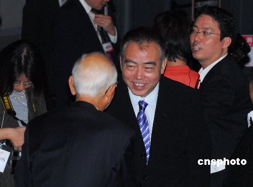 图为陈凯歌在电影周开幕式上与日本同行寒暄,他被本届东京电影节授予“黑泽明奖”。中新社发 侯宇 摄