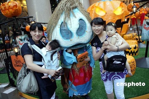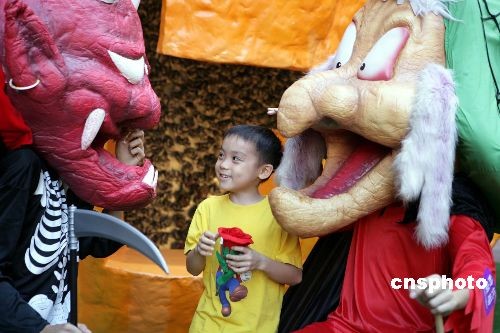 图为西方“鬼节”中的红魔鬼与小朋友嬉戏玩乐。