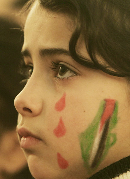 12月31日,一个脸上画着国旗的巴勒斯坦小女孩在西岸城市拉马拉为和平祈祷。面对国际社会巨大压力,以色列仍然拒绝停止对加沙地带的大规模空袭,最新统计数字显示,空袭已造成至少400人死亡,近2000人受伤。