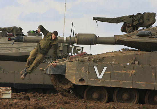 12月31日,在加沙边境地区,以军集结大量坦克和士兵。图为一名以军士兵正从一辆坦克上跳下。目前,面对国际社会巨大压力,以色列仍然拒绝停止对加沙地带的大规模空袭。