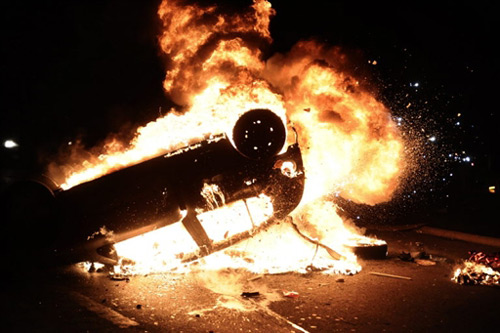 1月3日,在法国首都巴黎,一辆汽车在抗议以色列对加沙发动袭击的示威集会中被点燃。