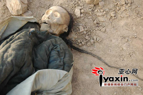 其中挖出的一具出土的干尸身高大约在1米7左右,中等身材,前额发际剃光,脑后拖着一根乌黑、细长的辫子,脸苍白发黄,干瘪的皮肤完好无损,上唇细软的胡须一根根清晰可见。穿着深蓝色的半长棉袄、深灰色的棉裤,青色的长衫衣襟敞开着,一双干瘦的脚裸露在外,脚上的皮肉被风干了,成了一对儿干瘪的深褐色脚丫。新疆文物考古研究所人员走近土堆旁的干尸,惊叹干尸保存得完好,完全可以陈列在博物馆。