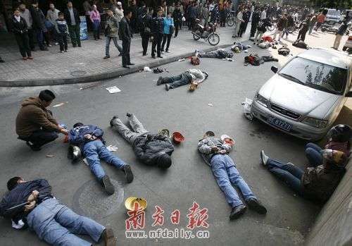 2009年1月13日上午10时30分许,记者在抓捕现场看到,广东佛山禅城区城巴总站出站口有20名被控制住的嫌疑人横七竖八地躺在地上。 张由琼 摄