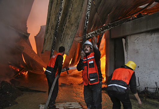 1月15日,巴勒斯坦消防人员为遭以军炮击后起火的联合国驻加沙的办公机构灭火。