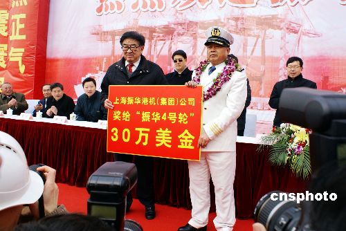1月23日上午,上海振华港机集团在长兴岛基地为“振华4号”轮顺利返航举行盛大欢迎仪式,“振华4号”船长彭维源带领29名船员整装首次集体亮相,并向众媒体记者和现场来宾介绍了抗击索马里海盗的具体经过。欢迎仪式现场,振华港机集团向每位船员颁发1万美元奖金,并授予船长“振华功臣金质奖章”。北京时间2008年12月17日中午,中国交通建设集团所属“振华4号”轮在途径亚丁湾水域时遭遇2艘海盗船袭击,有9名海盗登船,持冲锋枪和火箭筒在甲板上与我船员对峙,我船上的30名船员用高压水枪和自制燃烧弹自卫并反击。海盗在随后赶来的国际救援军舰直升机的威慑下,终于放弃攻击,狼狈逃窜。中新社发 李根 摄