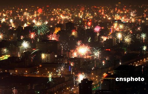 1月26日零时,北京在绚丽的烟花映衬下成为一片欢乐的海洋。中新社发 杜洋 摄