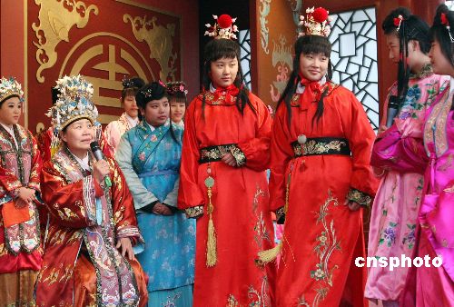 1月27日 (大年初二),北京大观园十四届红楼庙会吸引众多假日游客,本届庙会以弘扬中华传统文化为宗旨,以展现红楼文化为主题,呈现出改革开放30年来新北京、新宣武的精神风貌。庙会主要活动有“元妃省亲”、“宝黛成婚”“贾母贺寿”、红楼文化展览--木版年画展、红楼梦人物火花展以及红楼美食展示区等。图为在红楼庙会上由一对双胞胎扮演的“贾宝玉”富有戏剧色彩。中新社发 钱兴强 摄