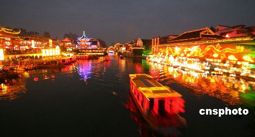 2009年1月28日晚,南京夫子庙景区灯火璀璨、景色迷人,吸引了四面八方的游人。人们看灯展、逛灯市、品小吃,领略新春佳节期间独特的秦淮风韵。