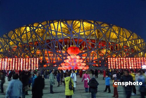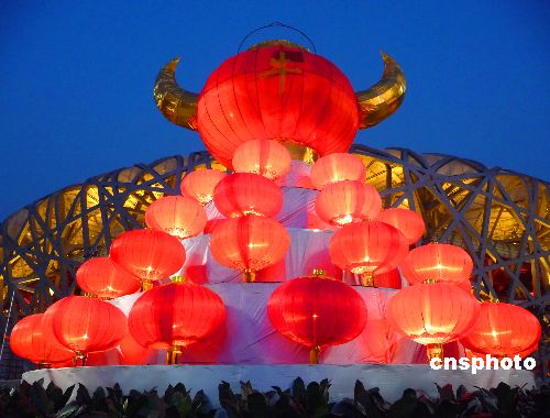 2009年1月31日傍晚,在北京奥林匹克公园中心区内,“金牛献福”、“年年有余”、“鸿福满仓”等钢材结构的雕塑及数千个大红灯笼,在牛年春节期间首次被安放在园区人流较集中的地方,与“鸟巢”、“水立方”交相辉映。中新社发 玉龙 摄