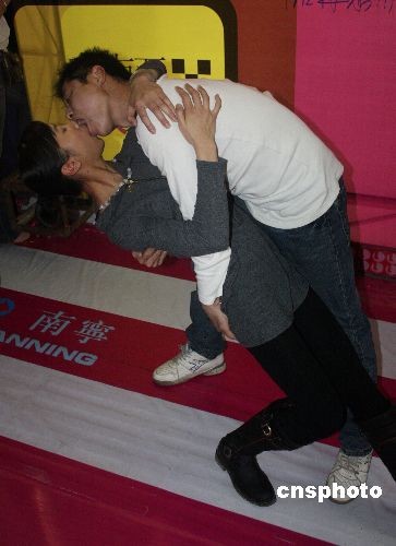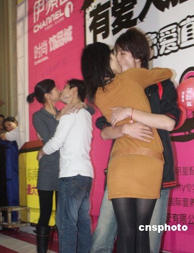 2月14日晚,广西南宁市一家商场举办的接吻大赛中,六对情侣不断变换各式接吻姿势一决高低。最终一对“90后”最终凭借千奇百怪的接吻姿势,在激吻近半小时后夺冠。中新社发 王刚 摄