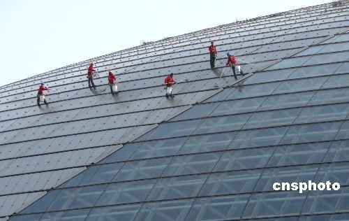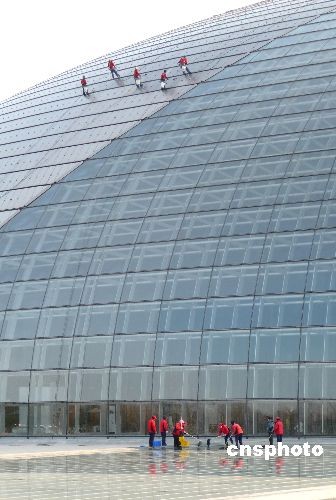 2009年2月22日,保洁人员正在认真清洗北京国家大剧院外壁及景观池玻璃上的尘土,使其以靓丽清洁的容貌迎接全国两会的召开。