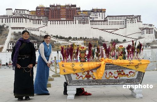 2月23日,拉萨布达拉宫广场布置巨型“切玛”迎接藏历新年。现场这位藏族老阿妈称这是她见过的最大的“切玛”。藏历新年时,藏族民众家家户户供“切玛”,人人都尝“切玛”。当客人走进藏民家时,主人首先会献“切玛”,客人从堆放在“钵”中的“切玛”里拿出一点儿来,并说“扎西德勒”(吉祥如意之意),尔后放进嘴里,预祝新春如意、身体康健。