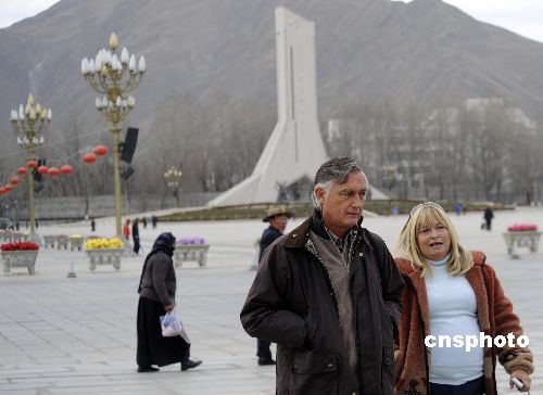 2月23日,外国游客在拉萨布达拉宫广场游览。当日,西藏许多机构已经放假,欢度即将来临的藏历新年。中新社发 廖攀 摄