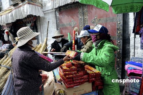 2月23日,藏历新年前夕,西藏拉萨小昭寺路年货集市上,藏族民众欢欢喜喜置办年货。