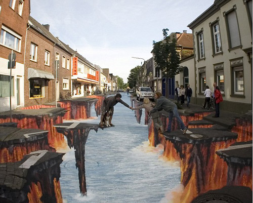 中新网2月24日电 据英国媒体报道,一个名为《冰河世纪》的3D街道艺术作品由一位德国街头艺术家在爱尔兰敦拉奥海里创作成功。画面逼真,犹如身临其境——冰河在行人的脚下融化,顿成万丈深渊;脚下的火山喷发,人们伸手相助……作品耗时5天,占地250平方米。