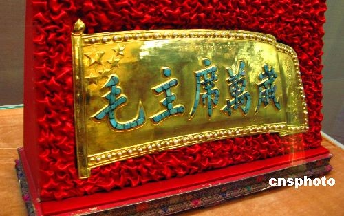 2月25日,在北京民族文化宫举办的《西藏民主改革50年大型展览》免费向民众开放。图为展会展出十世班禅额尔德尼献给毛泽东主席的“毛主席万岁”金盾。中新社发 邹宪 摄