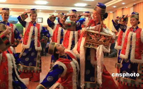 2月25日是藏历新年初一,甘肃省甘南藏族自治州合作地区的藏族官员和民众汇集甘南饭店举行联欢会,庆祝新年。图为甘南州歌舞剧院表演舞蹈《祝福吉祥》。中新社发 殷春永 摄