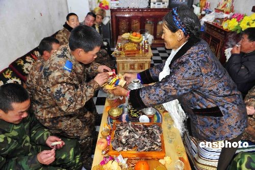 2月25日藏历大年初一,海拔5374米的驻藏空军甘巴拉雷达站官兵,受到驻地藏民央金一家的盛情邀请,与他们一家五口共度藏历新年。图为60多岁的老阿妈请官兵们品尝自已亲手制做的土特产。中新社发 郭超英 摄