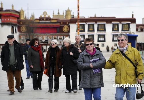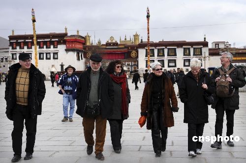 2月26日,中国藏历年初二,十多名德国游客在西藏拉萨大昭寺前游览,他们是通过中国国际旅行社总社组团来到西藏的。旅游日程包括参观拉萨著名景点和藏民家庭旅馆体验住宿,德国游客表示藏民的热情好客给他们留下了深刻印象。中新社发 廖攀 摄