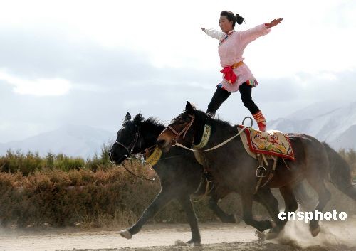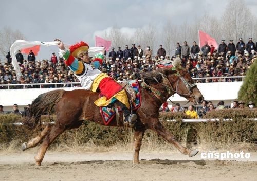 2月27日,中国藏历年初三,在拉萨市北郊的赛马场,传统赛马与马术表演活动隆重举行,身怀绝技的骑手们为成千上万的观众表演了精彩绝伦各种节目。中新社发 周波 摄