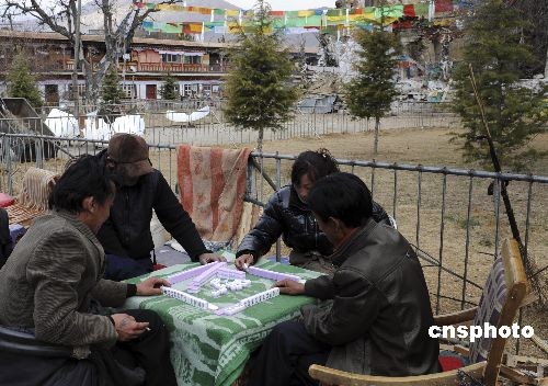 2月28日,拉萨市东城策门林藏民聚居区,社区居民搭起桌子在室外打麻将休闲。中新社发 廖攀 摄