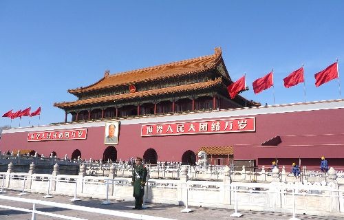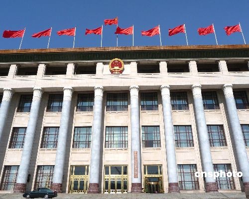 2009年3月1日,北京阳光灿烂、碧天如洗。天安门广场四周鲜艳的红旗迎风飞舞,洋溢出一派喜庆祥和的气氛,迎接全国两会的召开。中新社发 玉龙 摄