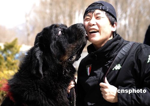 2009年初春,中新社特派记者一行到西藏藏獒协会养殖基地采访,《中国新闻周刊》记者刘震被喜马拉雅河谷型藏獒口水四溅地热吻,逗得大家啼笑皆非。中新社发 廖攀 摄