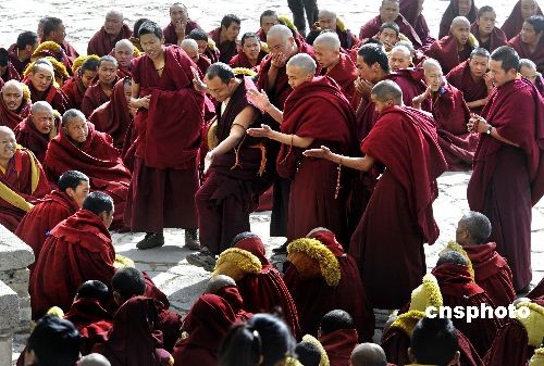 3月4日,中国藏历新年正月初八,西藏拉萨哲蚌寺举行传昭大法会,措钦大殿前僧人辩经场面激烈。中新社发 廖攀 摄
