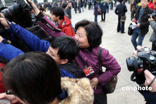 3月3日,爱好摄影的全国政协委员、浙江省政协副主席盛昌黎,在全国两会期间“机不离身”,随时准备拍摄身边发生人和事。图为盛昌黎委员正在和记者“抢拍”。中新社发 宋健浩 摄