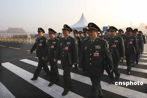 3月5日,十一届全国人大二次会议在北京人民大会堂开幕。解放军代表团整齐步入会场。中新社发 盛佳鹏 摄